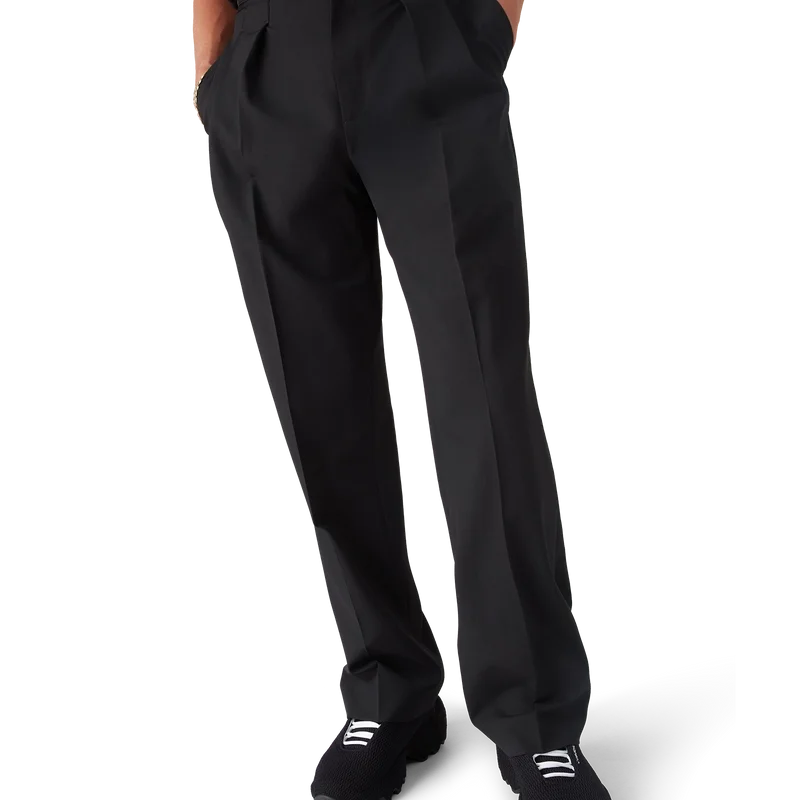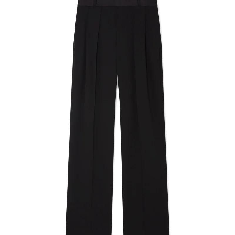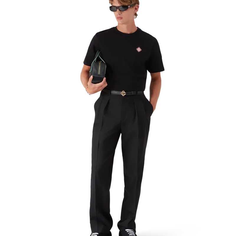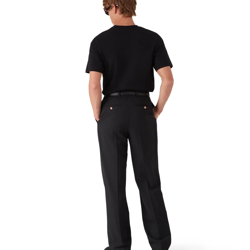 De wollen broek met plooien heeft een rechte pijp en is vervaardigd uit kostuumstof. Afgewerkt met plooien aan de voorkant, ritssluiting, schuine zakken aan de voorkant, een voering, riemlussen en paspelzakken aan de achterkant met het in elkaar grijpende CC-logo van het huis, vergulde, geëmailleerde knopen met platte schacht.