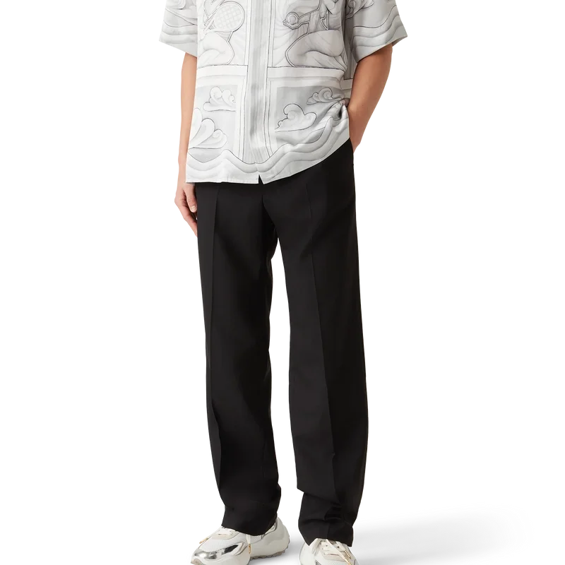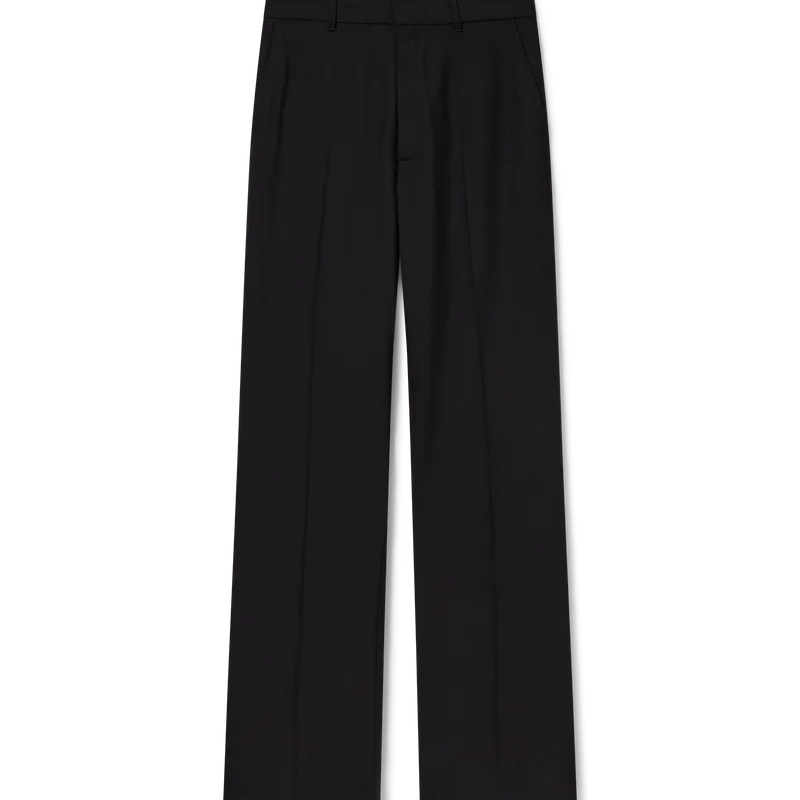 De op maat gemaakte wollen broek heeft een slank ontwerp, is vervaardigd van scheerwol en heeft een voering van katoenmix. Afgewerkt met riemlussen, ritssluiting, schuine zijzakken en paspelzakken aan de achterkant.