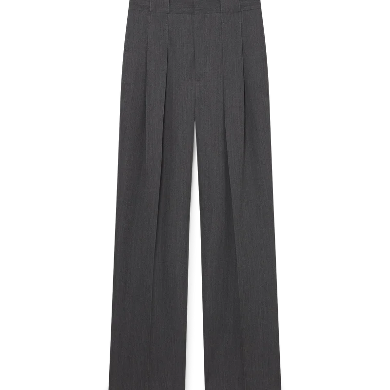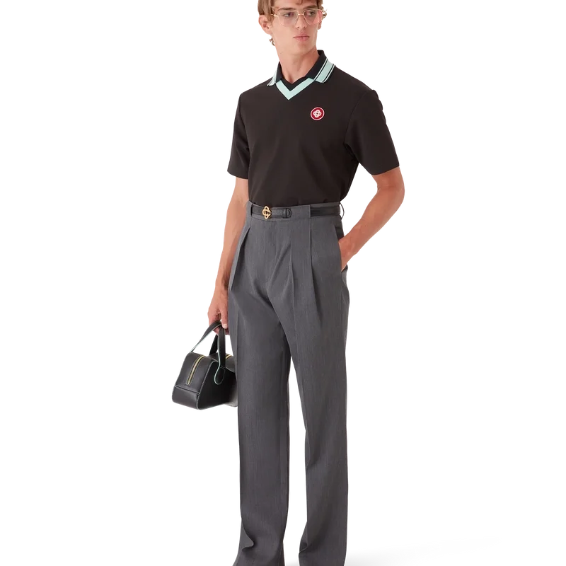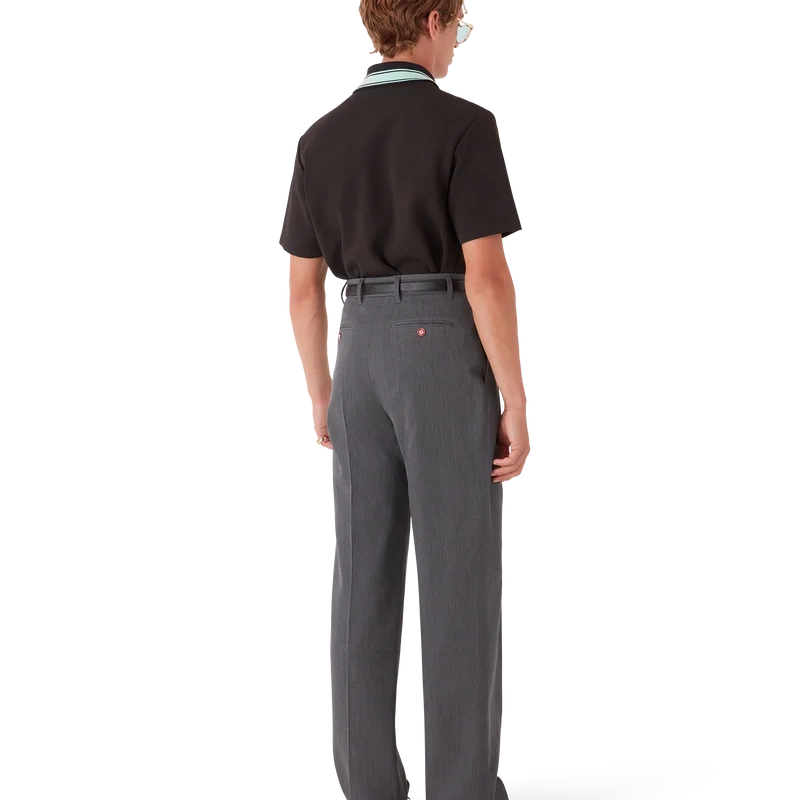 De wollen broek met riemlussen heeft een rechte pijp en is vervaardigd van kostuumstof. Afgewerkt met plooien aan de voorkant, ritssluiting, schuine voorzakken, een voering, riemlussen en paspelzakken aan de achterkant met het in elkaar grijpende CC-logo van het huis, vergulde, geëmailleerde knopen met platte schacht.