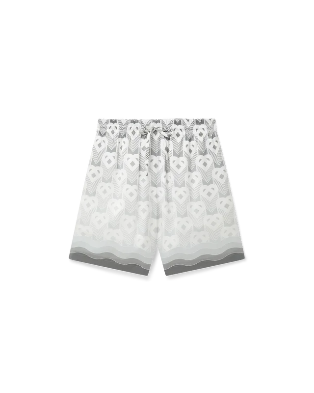 De zijden short met hartjesmonogram in kleurverloop heeft een all-over print met het hartjesmonogram van het huis op de zilveren achtergrond met kleurverloop van dit seizoen. Gemaakt van een zijden satijnen stof met monogram en afgewerkt met een elastische tailleband, trekkoordsluiting, zijzakken in de naad, een opgestikte zak aan de achterkant en een zoomdetail geïnspireerd op de Memphis-golf in kleurverloop.