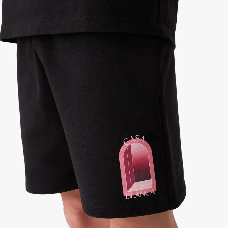 De zwarte L’arche-sweatshorts hebben een verfijnd ontwerp, met een kenmerkende zeefdruk van de boog, een abstract symbool van kracht. Afgewerkt met een elastische tailleband, een trekkoord met gouden uiteinden, zijzakken en een opgestikte achterzak.