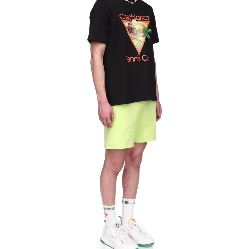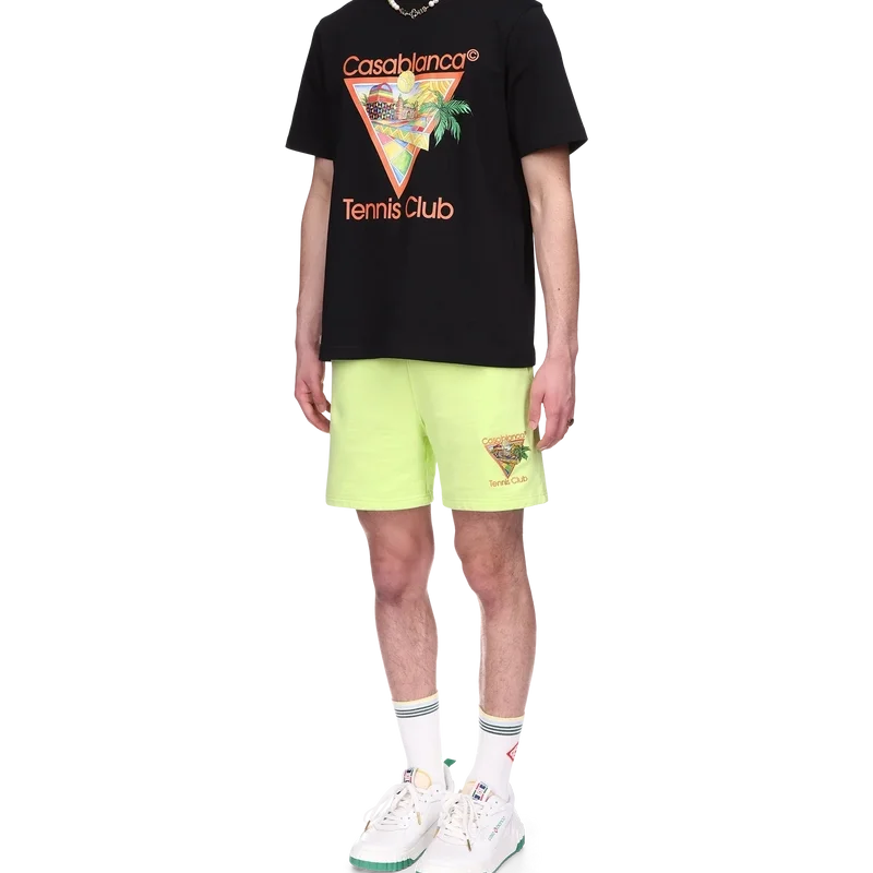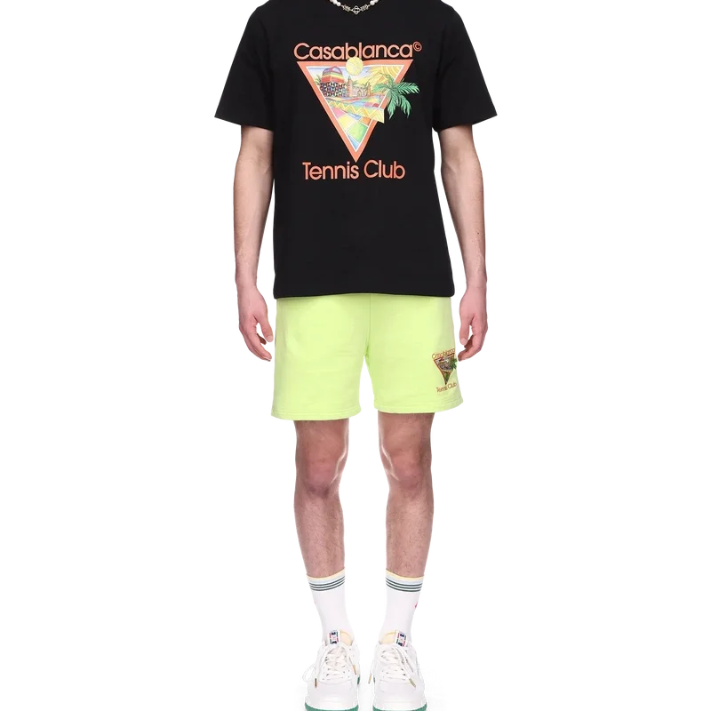Het Afro Cubism Tennis Club T-shirt is een bedrukt ontwerp geïnspireerd door de warmte van de traditionele architectuur van Nigeria; de schoonheid van de traditionele en organische kunst wordt weergegeven als een landschap, met behoud van onze traditionele indeling: de palmboom, het perspectief van het gebouw en een tennisbaan. Gemaakt van biologisch katoen, voorzien van een klassieke ronde hals.