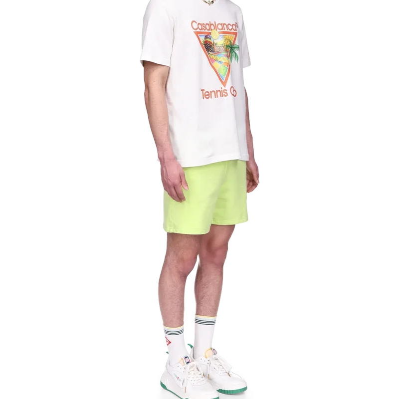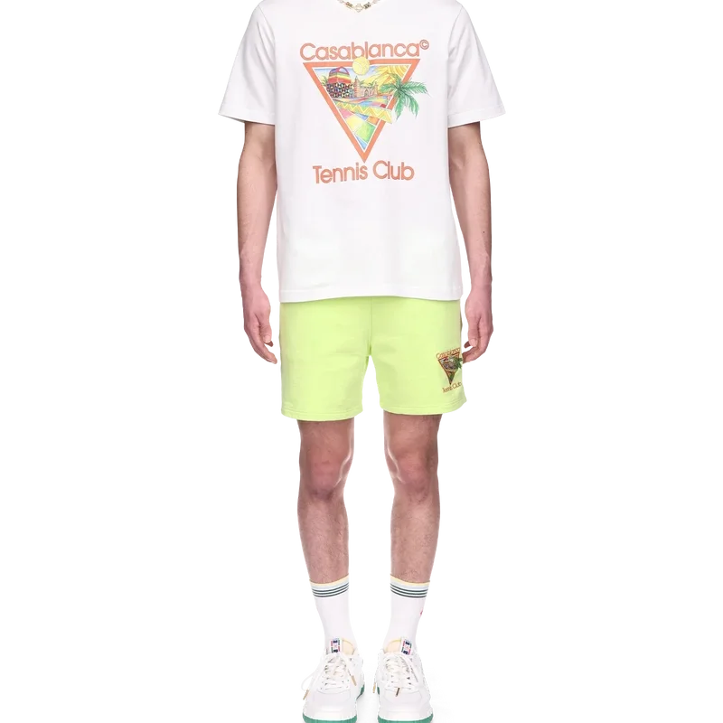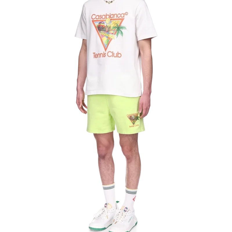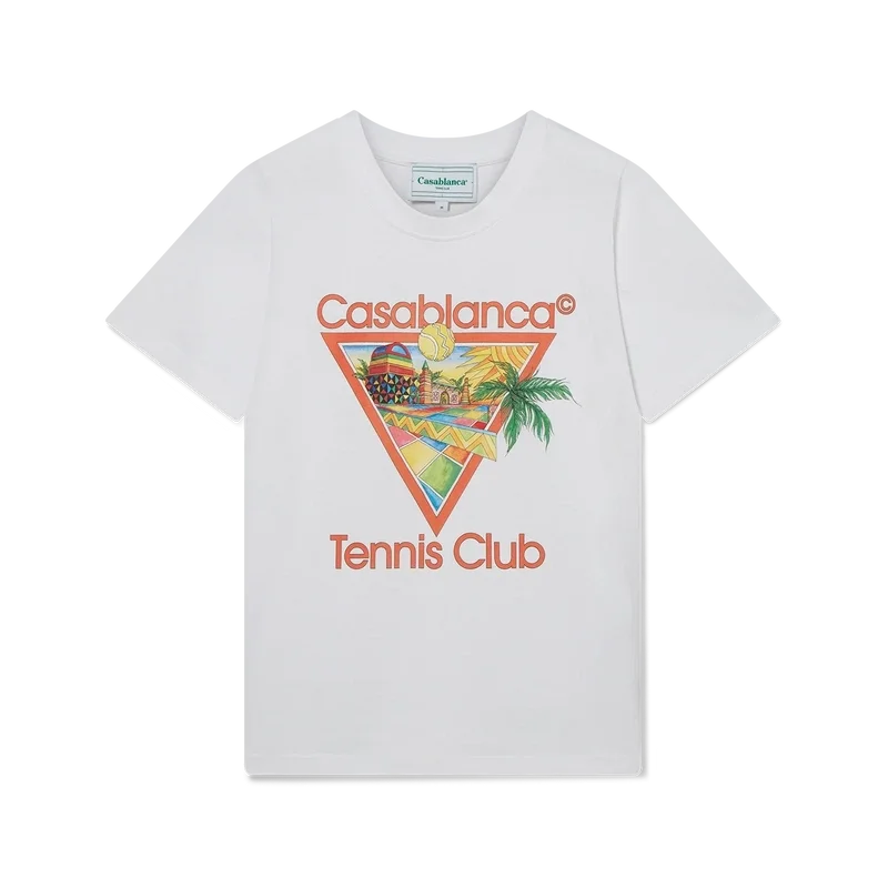 Het Afro Cubism Tennis Club T-shirt heeft een print die is geïnspireerd op de warmte van de traditionele architectuur van Nigeria; de schoonheid van de traditionele en organische kunst wordt weergegeven als een landschap, met behoud van onze traditionele lay-out: de palmboom, het perspectief van het gebouw en een tennisbaan. Gemaakt van biologisch katoen, compleet met een klassieke ronde hals.