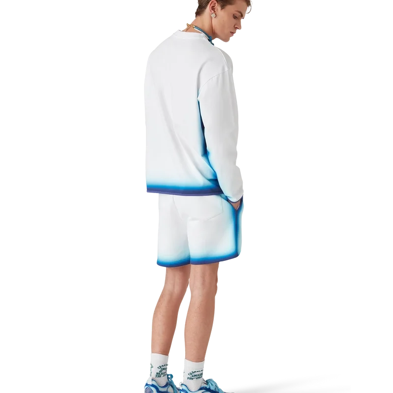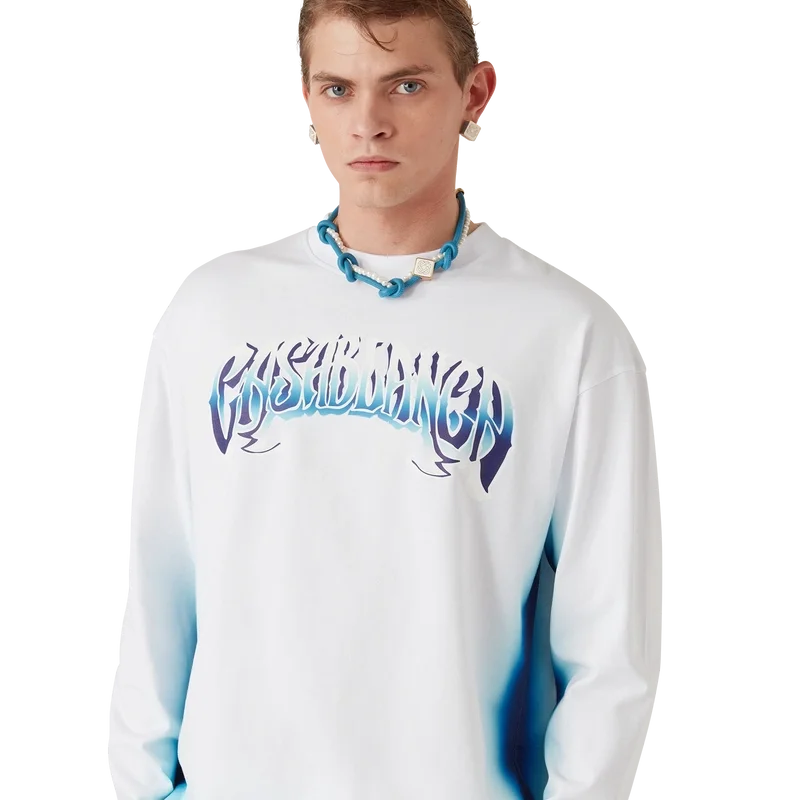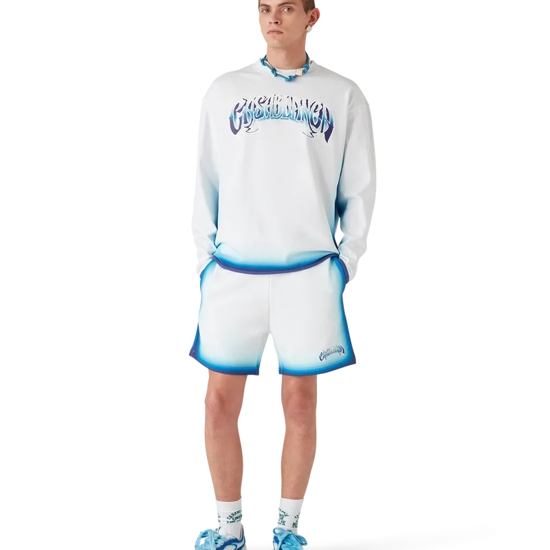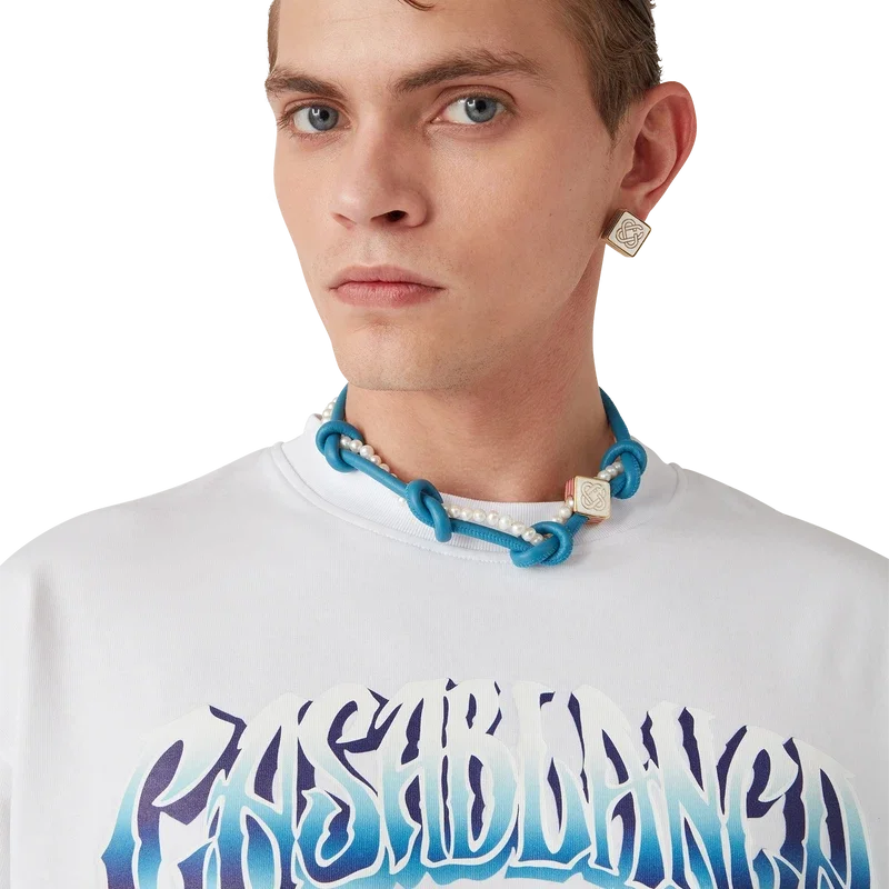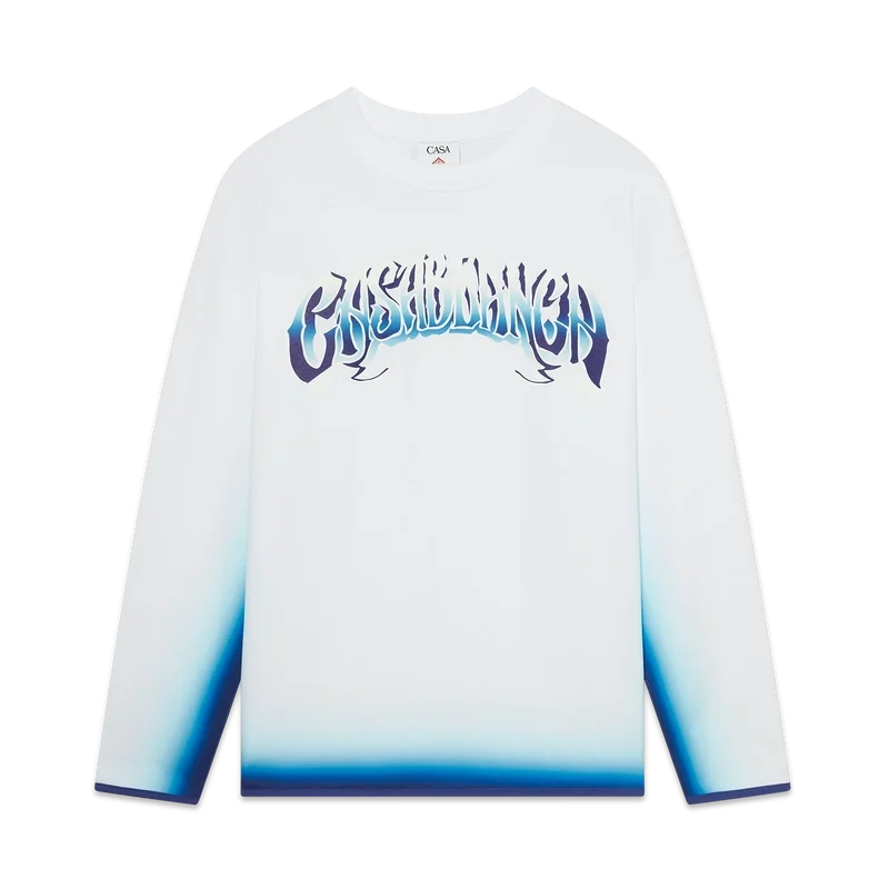 Het Blue Fade T-shirt met lange mouwen is een bedrukt ontwerp gemaakt van biologisch katoen en voorzien van handgetekende typografie van het Casablanca-logo, geïnspireerd op het gotische lettertype dat in tatoeages wordt gebruikt. Afgewerkt met een klassieke ronde hals.