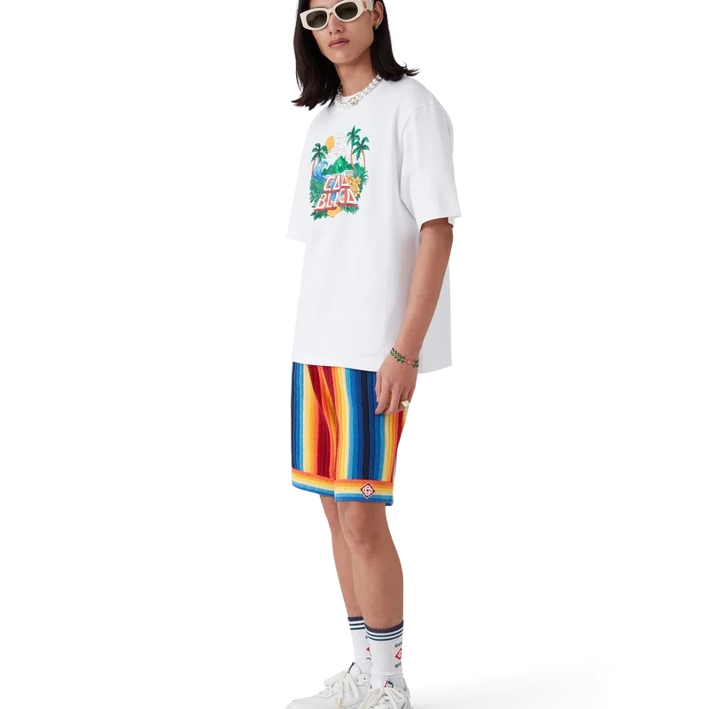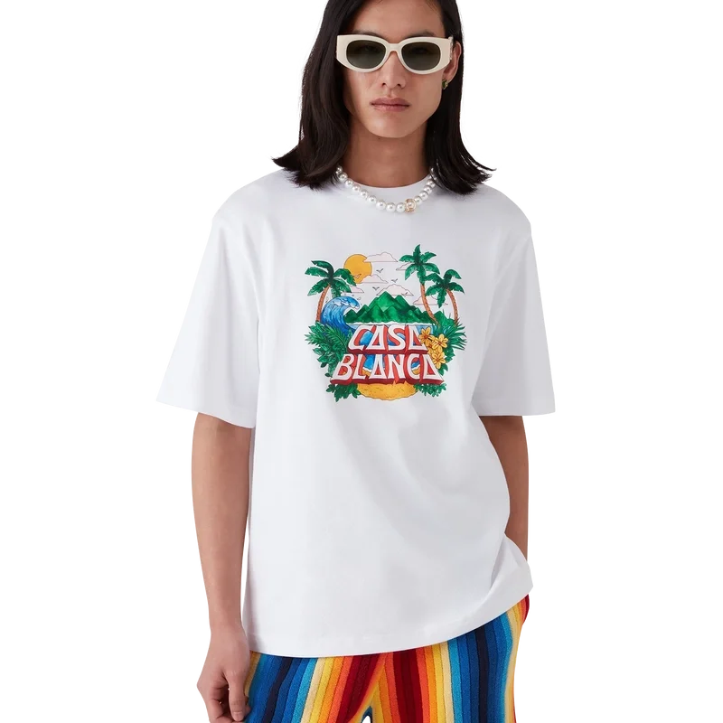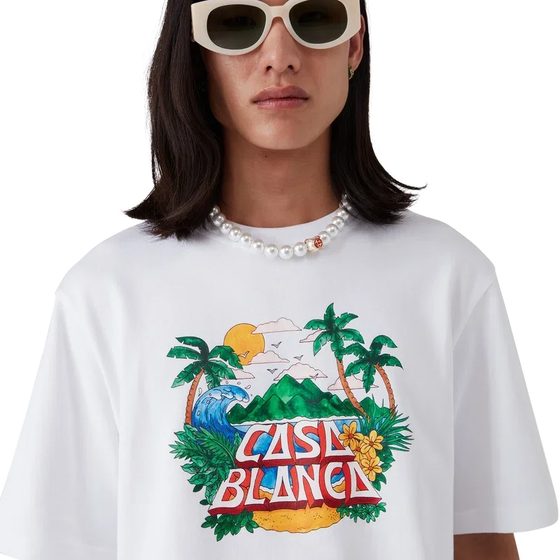 Het Casa Beach Wave T-shirt is een bedrukt ontwerp met korte mouwen, gemaakt van biologisch katoen en voorzien van kenmerkende illustraties die verwijzen naar een souvenir-T-shirt dat je zou kopen tijdens een strandvakantie. Afgewerkt met een klassieke ronde hals.