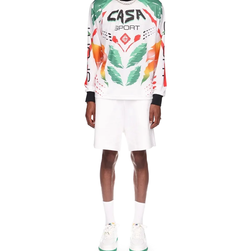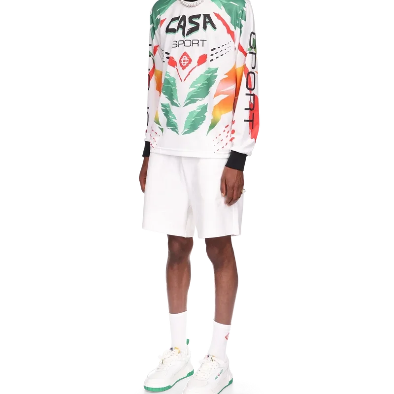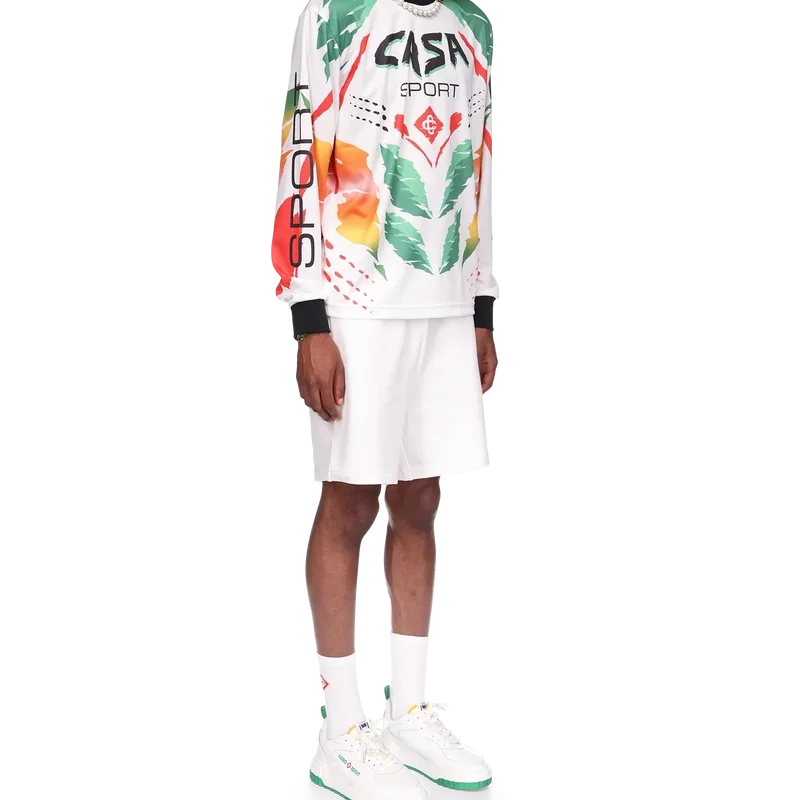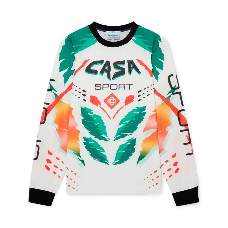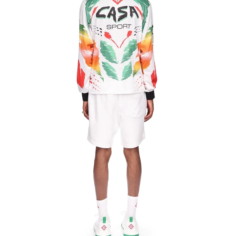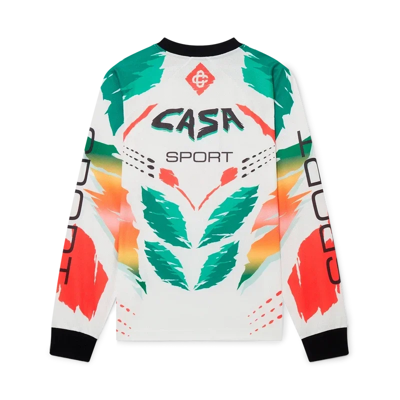 Het Casa Moto T-shirt met lange mouwen is een op sportkleding geïnspireerd ontwerp met het in elkaar grijpende Cc-logo van het huis en de warme kleuren van het seizoen, die symbool staan voor de rijke uitwisselingen tussen verschillende culturele disciplines in de Afrikaanse kunst, muziek en film. Afgewerkt met een contrasterende geribde kraag en manchetten.