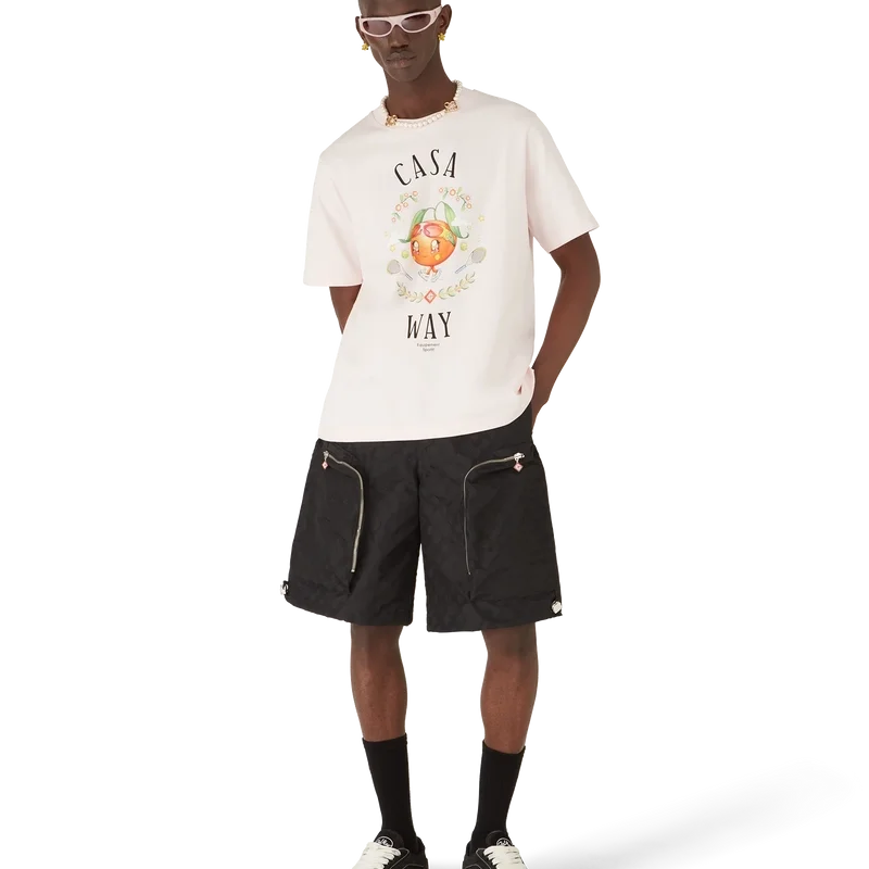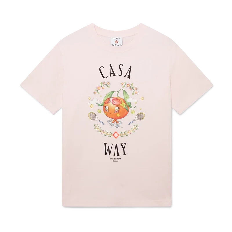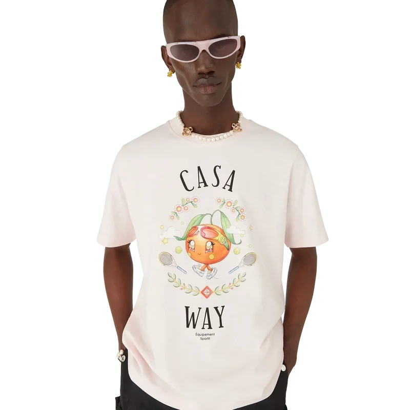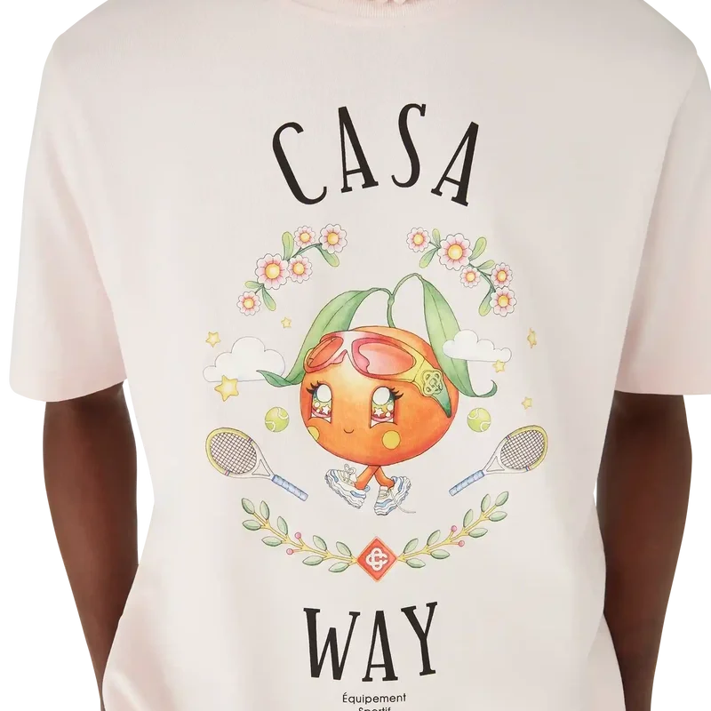 Het Casa Way Orange Mascot T-shirt is een T-shirt met korte mouwen en een print met seizoensgebonden illustraties van de Kawaii Orange. Dit personage is een ander belangrijk figuur in ons universum en draagt Casa-accessoires, een bril en sneakers. Afgewerkt met een klassieke ronde hals.