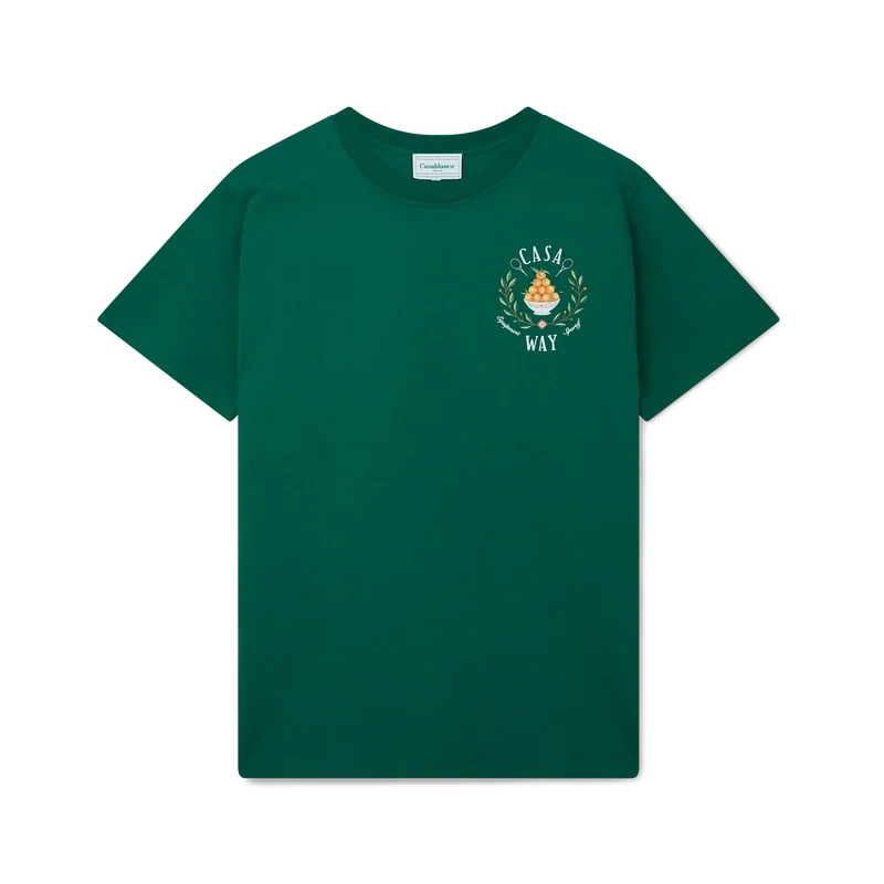 Het Casa Way T-shirt is voorzien van een print van het klassieke iconografische ontwerp van het huis met de oranje piramide, tennisrackets en bloemmotief, dat in een grotere print op de achterkant is herhaald. Gemaakt van 100% biologisch katoen en afgewerkt met een klassieke ronde hals en een Casablanca-merklabel.