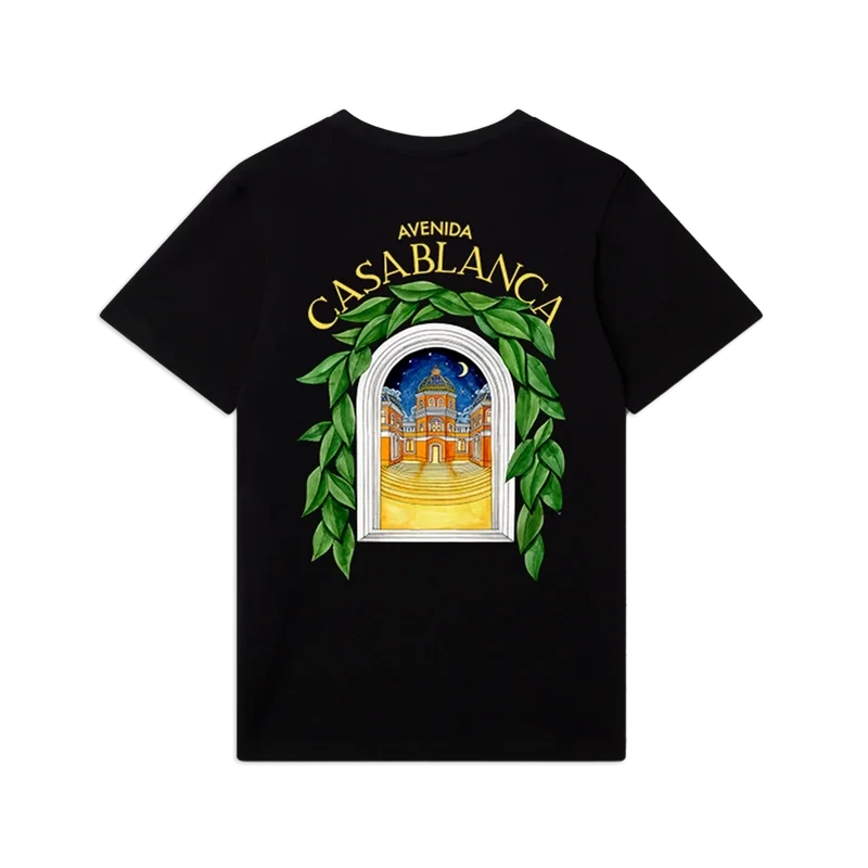 Het Casablanca Avenida T-shirt in zwart is voorzien van een seizoensgebonden zeefdrukontwerp waarin de vrije stroom van de natuur samenkomt met de structuur van het door mensen gemaakte ontwerp: de boog, een abstract symbool van kracht. Afgewerkt met een klassieke ronde hals, korte mouwen en een Casablanca Paris-merklabel, ontworpen voor een relaxte pasvorm.