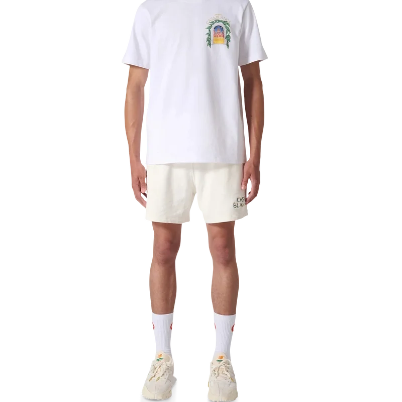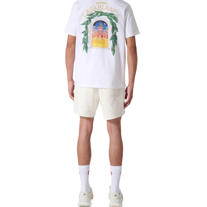 Het Casablanca Avenida T-shirt in wit is voorzien van een seizoensgebonden zeefdrukontwerp waarin de vrije stroom van de natuur samenkomt met de structuur van het door de mens gemaakte ontwerp: de boog, een abstract symbool van kracht. Afgewerkt met een klassieke ronde hals, korte mouwen en een Casablanca Paris-merklabel, ontworpen voor een relaxte pasvorm.