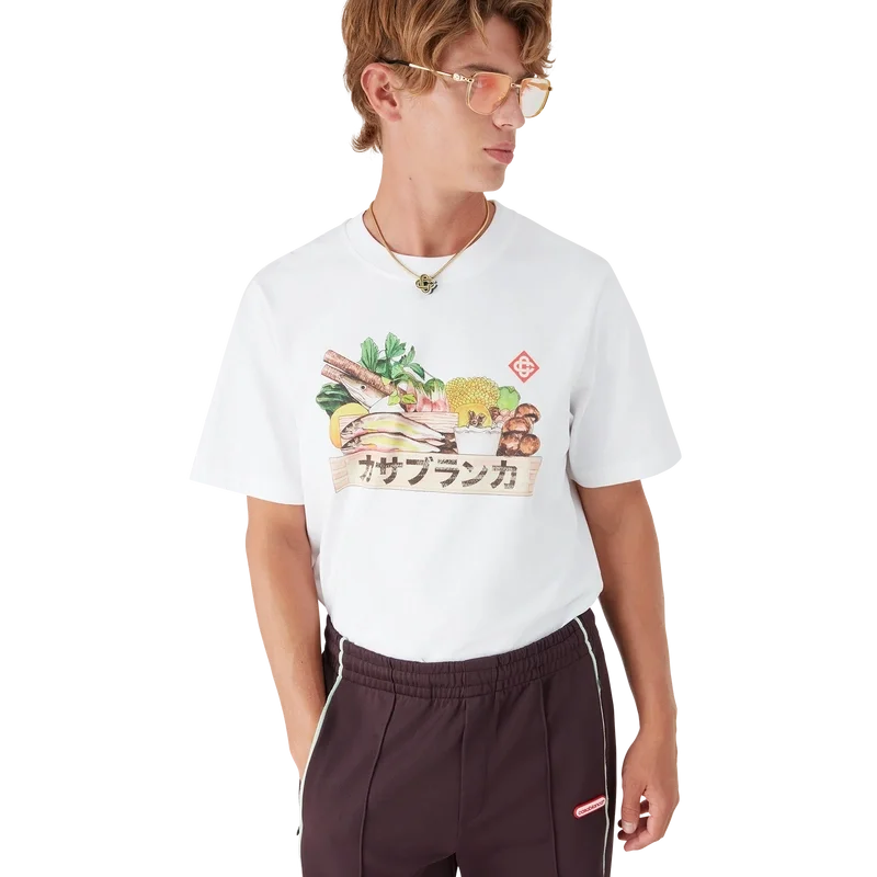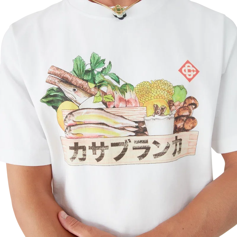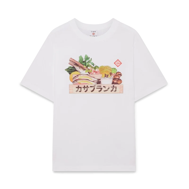 Het Ingredients T-shirt is een T-shirt met korte mouwen en een print met seizoensgebonden illustraties die de betekenis van voedsel in Japan weerspiegelen en het belang dat wordt gehecht aan natuurlijke ingrediënten in hun ruwe vorm. Het is gemaakt van biologisch katoen en heeft een klassieke ronde hals.