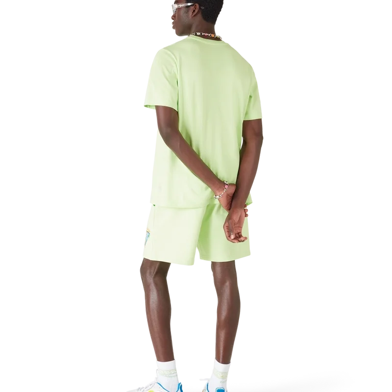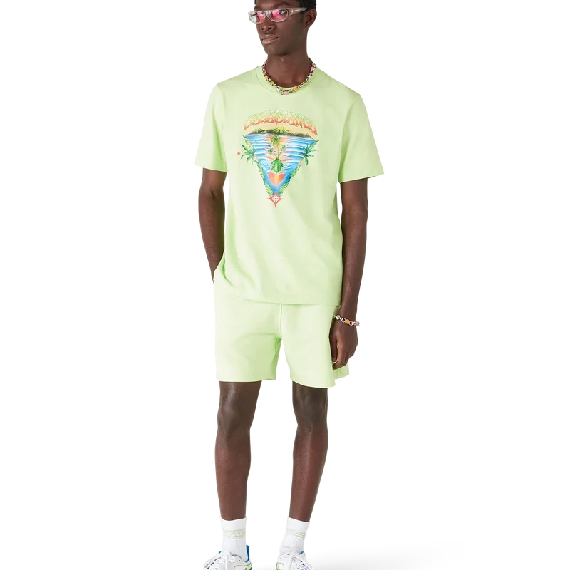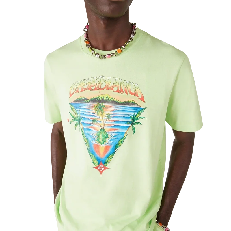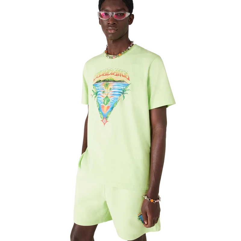 Het Innocence Triangle Classic T-shirt toont een oceaanscène bij zonsondergang met een eiland in het midden, weergegeven in een stijl die is beïnvloed door klassieke surf-T-shirtkunst. Het ontwerp legt de etherische schoonheid van het gouden uur boven tropische wateren vast en presenteert een geïdealiseerd beeld van een strandparadijs door de verfijnde sport- en vrijetijdsbril van het huis. Afgewerkt met een ronde hals, korte mouwen en een relaxte pasvorm die de verfijnde benadering van casualkleding van het huis belichaamt.