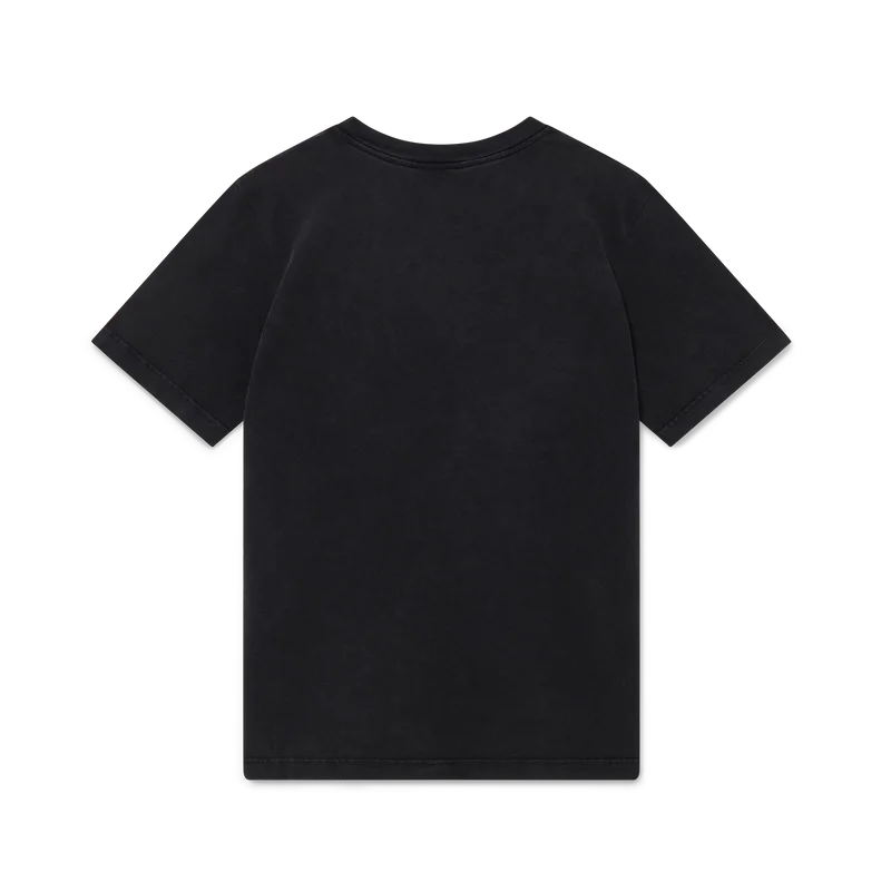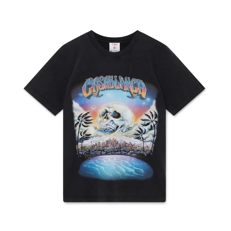 Het La Pramonition Crystal T-shirt is een bedrukt ontwerp met korte mouwen, vervaardigd van biologisch katoen. Het is voorzien van kenmerkende kunst, geïnspireerd door een griezelig visioen van de skyline van La bij nacht, met UFO-elementen die verwijzen naar vintage sci-fi-inspiratie. Afgewerkt met een klassieke ronde hals.