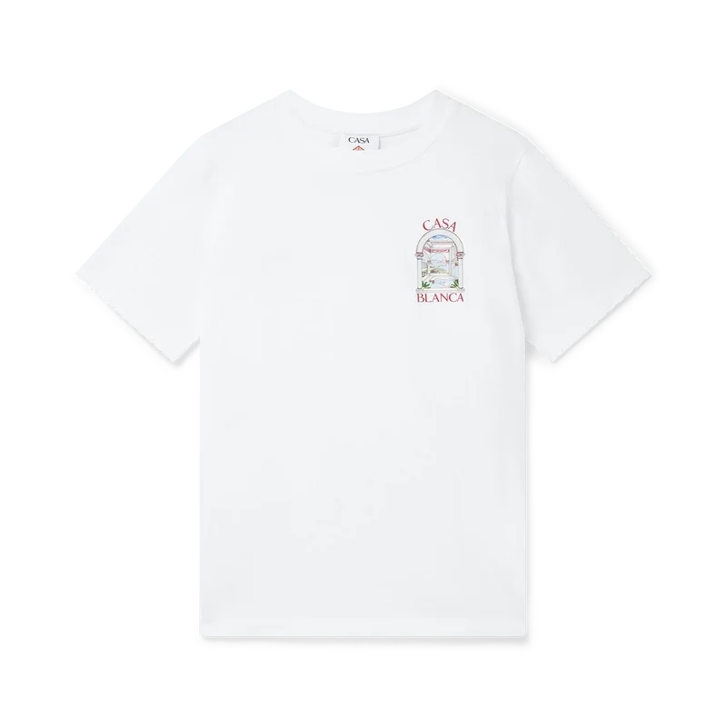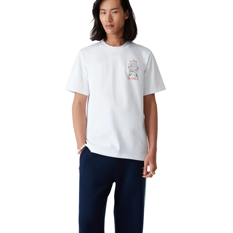 Het Le Passage T-shirt is een ontwerp met korte mouwen, gemaakt van biologisch katoen en voorzien van de seizoensgebonden kunst van het huis – met vier verschillende dimensies die spelen met perspectieven en architectuur. Afgewerkt met een klassieke ronde hals.