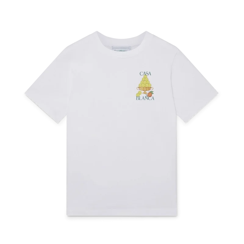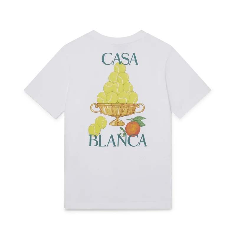 Het Le Triomphe De Tennis T-shirt is een bedrukt ontwerp met korte mouwen, vervaardigd van biologisch katoen, met de iconische oranje piramide-illustratie van het huis, opnieuw geïnterpreteerd voor dit seizoen. Afgewerkt met een klassieke ronde hals en Casablanca-merktekst.