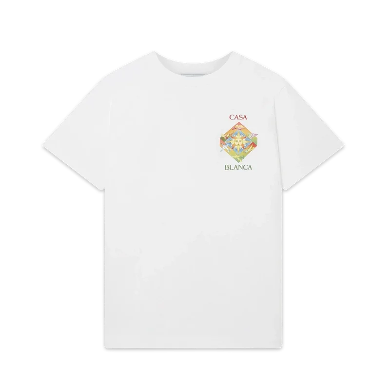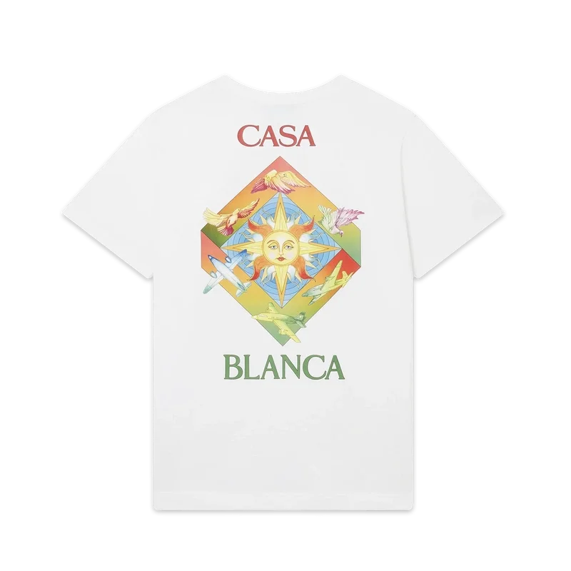 Het Les Elements T-shirt van biologisch katoen met zeefdruk is voorzien van seizoensgebonden kunstwerk waarin de symboliek van Casablanca en Arabische iconografie zijn verwerkt, met vredesduiven. Afgewerkt met een klassieke ronde hals, korte mouwen en een Casablanca Paris-merklabel, ontworpen voor een relaxte pasvorm.