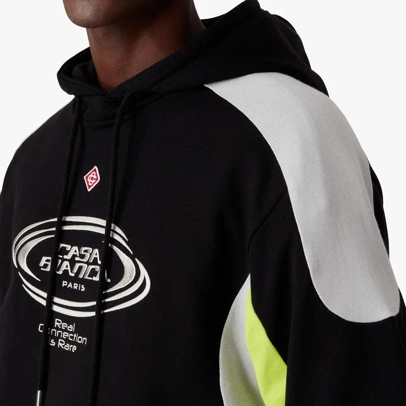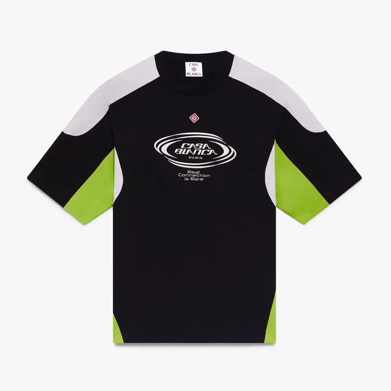 Het zwarte en grijze oversized T-shirt met korte mouwen en kleurblokken heeft een verfijnd ontwerp, met een kleurblokpatroon en het kenmerkende diamantlogo van het huis. Afgewerkt met een klassieke ronde hals, het Casablanca-logo van het huis en een oversized silhouet.