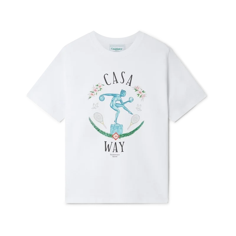 Het Statue En Marbre T-shirt is een ontwerp met korte mouwen, gemaakt van biologisch katoen, met seizoensgebonden artwork geïnspireerd op art deco en een eerbetoon aan het beeldhouwwerk van een dame die twee tennisballen, tennisrackets en laurierbladeren vasthoudt. Afgewerkt met een klassieke ronde hals en het Casa Way-logo.