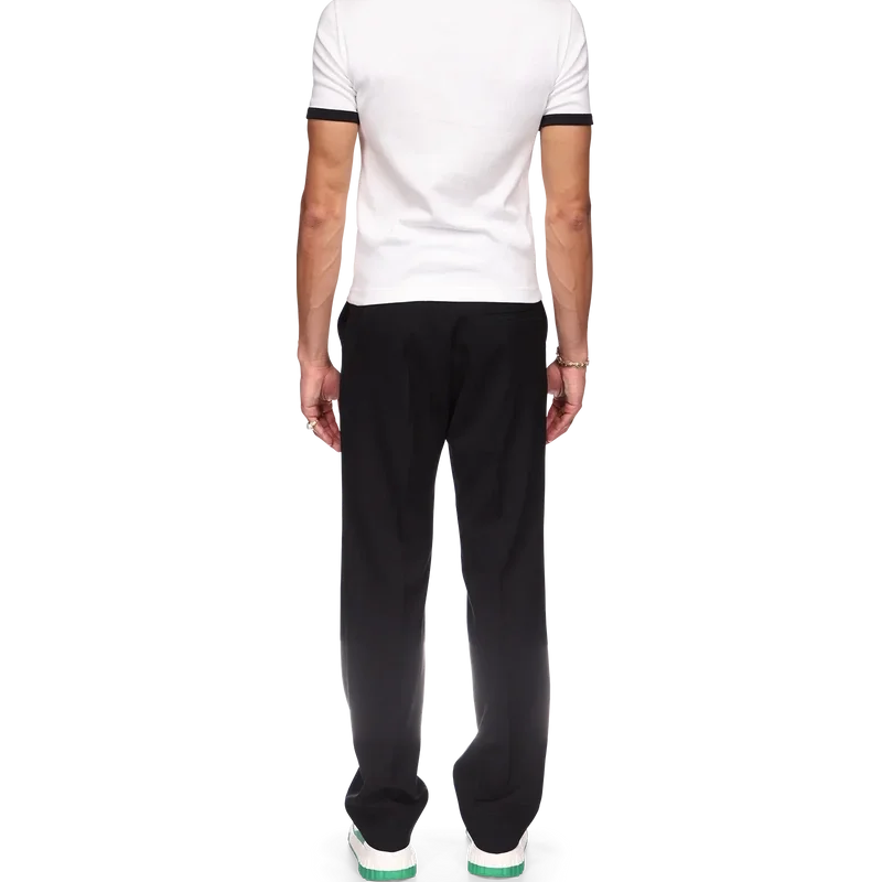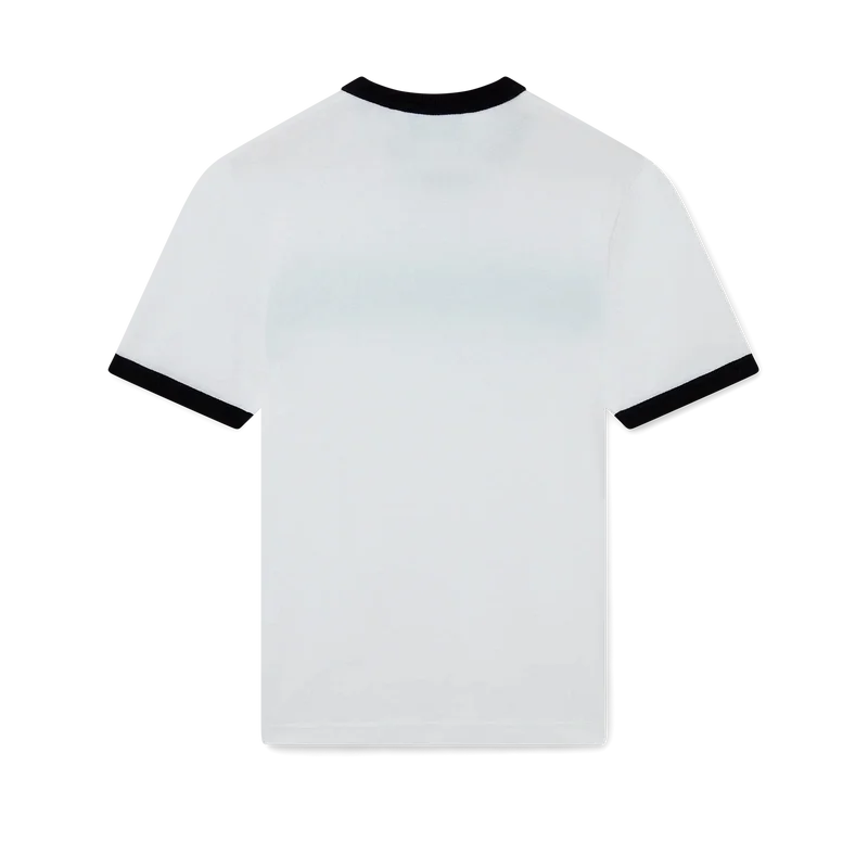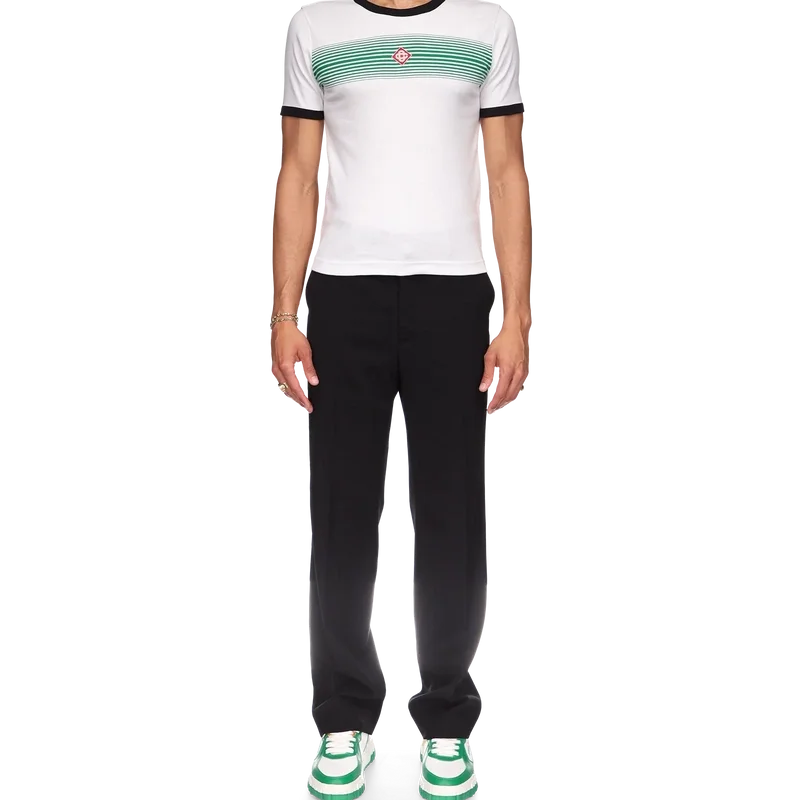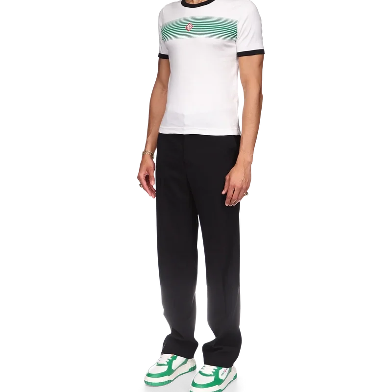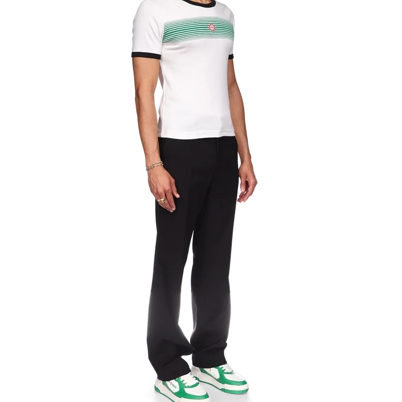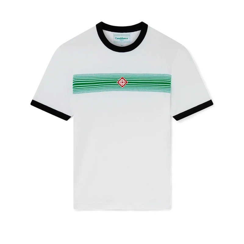 Het T-shirt met gestreepte rand en kleurverloop heeft een getailleerd ontwerp, geïnspireerd op de kleuren van de Nigeriaanse vlag, en is voorzien van het diamantlogo van het huis. Het is gemaakt van biologisch katoen en afgewerkt met een klassieke ronde hals, met een contrasterende geribde kraag en manchetten.