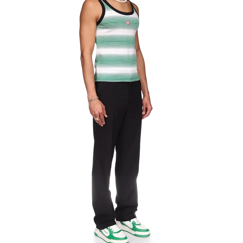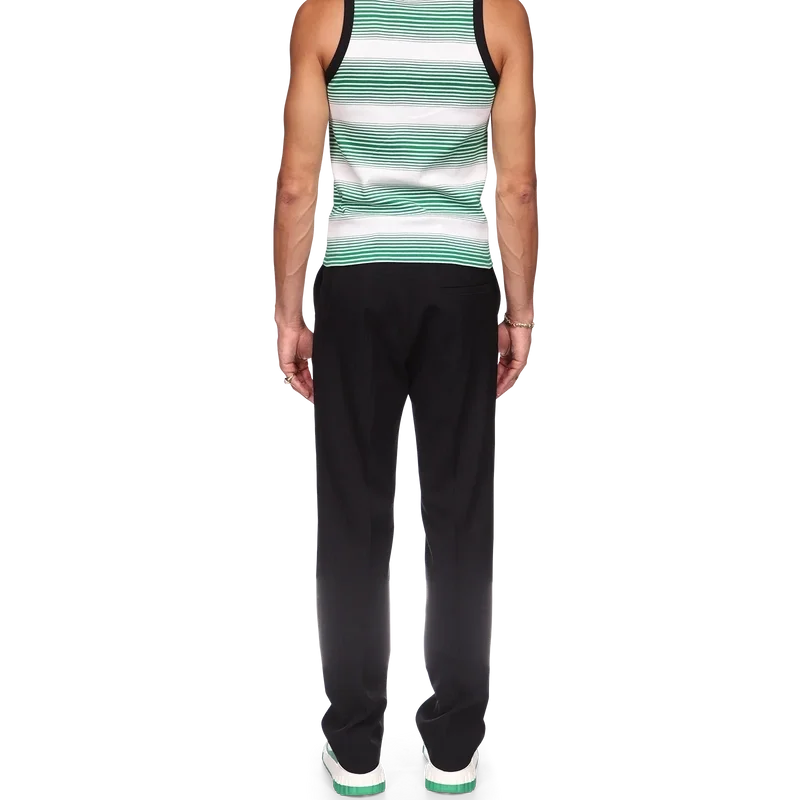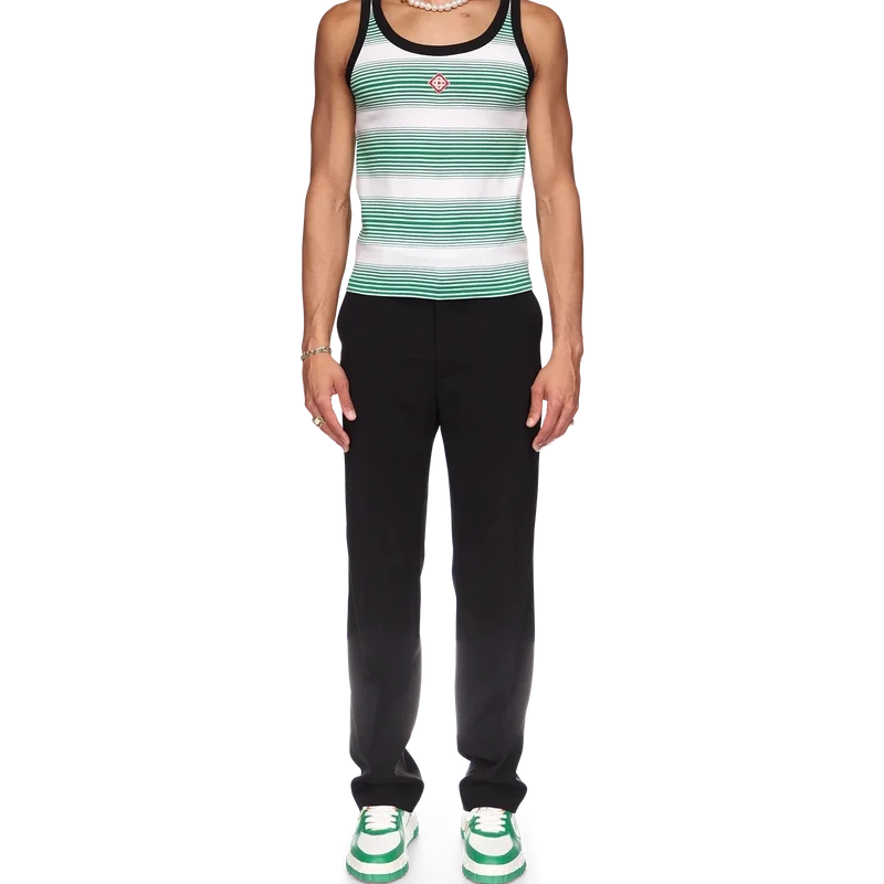 De Gradient Stripe Ringer Tank Top is een klassiek ontwerp, vervaardigd van een garengeverfde biologische katoenen stof en geïnspireerd door de kleuren van de Nigeriaanse vlag. Afgewerkt met een ronde hals, een contrasterende geribde kraag en armsgaten.