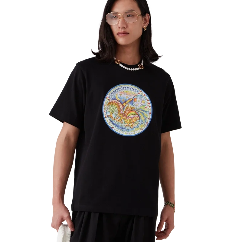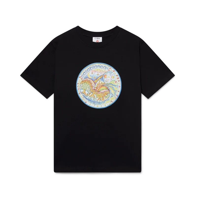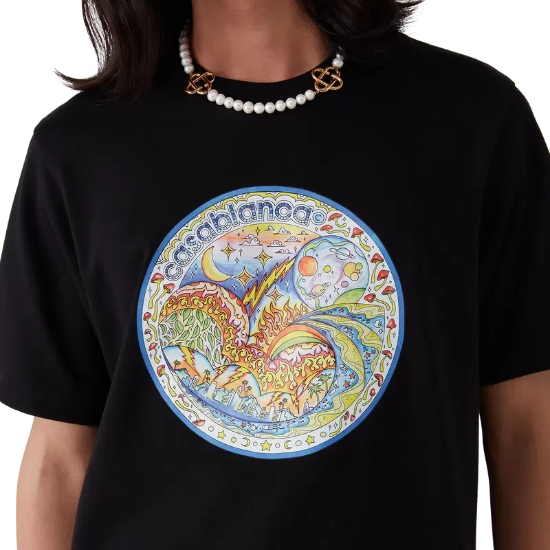 Het Four Elements T-shirt is een bedrukt ontwerp met korte mouwen, gemaakt van biologisch katoen en voorzien van kenmerkende kunst in een print die alle elementen van La samenbrengt: de skyline, het strand, vuur, vegetatie en astronomie. Afgewerkt met een klassieke ronde hals.