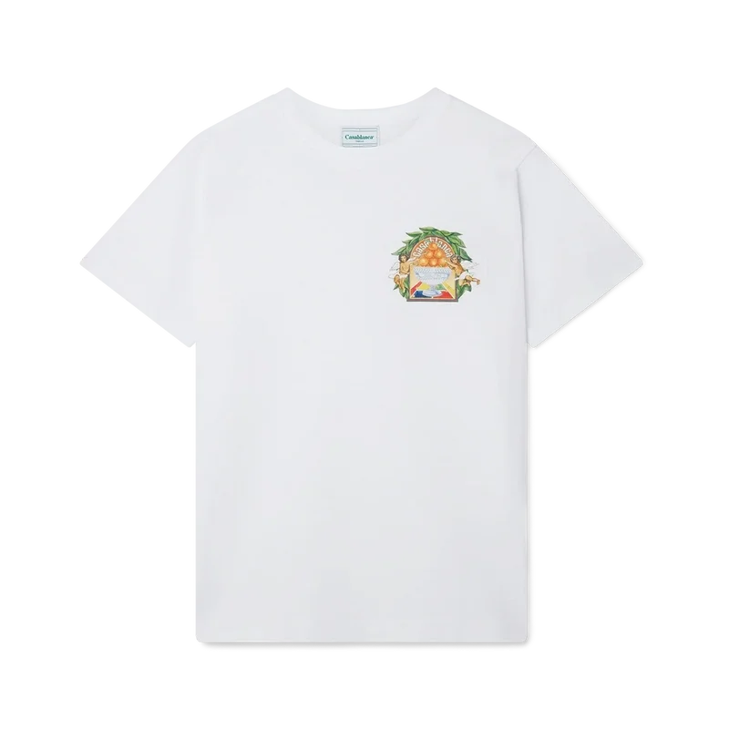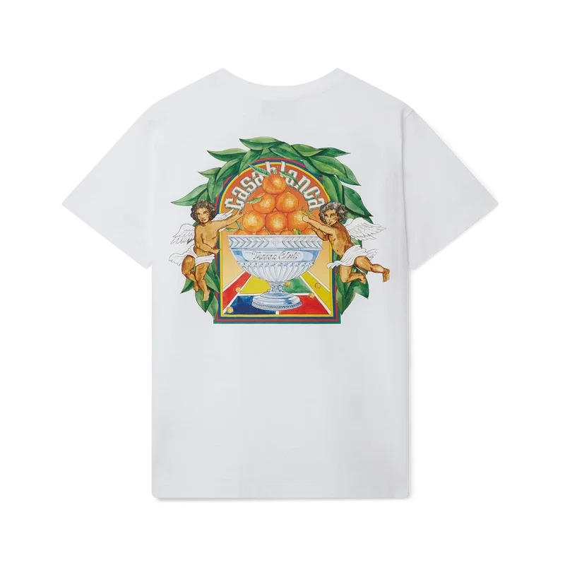 Het Triomphe D’orange T-shirt is voorzien van een print van het kenmerkende kunstwerk van het huis, waarin tennis en onze oranje piramide zijn verwerkt, herhaald in een grotere print op de achterkant. Gemaakt van 100% biologisch katoen en afgewerkt met een klassieke ronde hals en een Casablanca-merklabel.