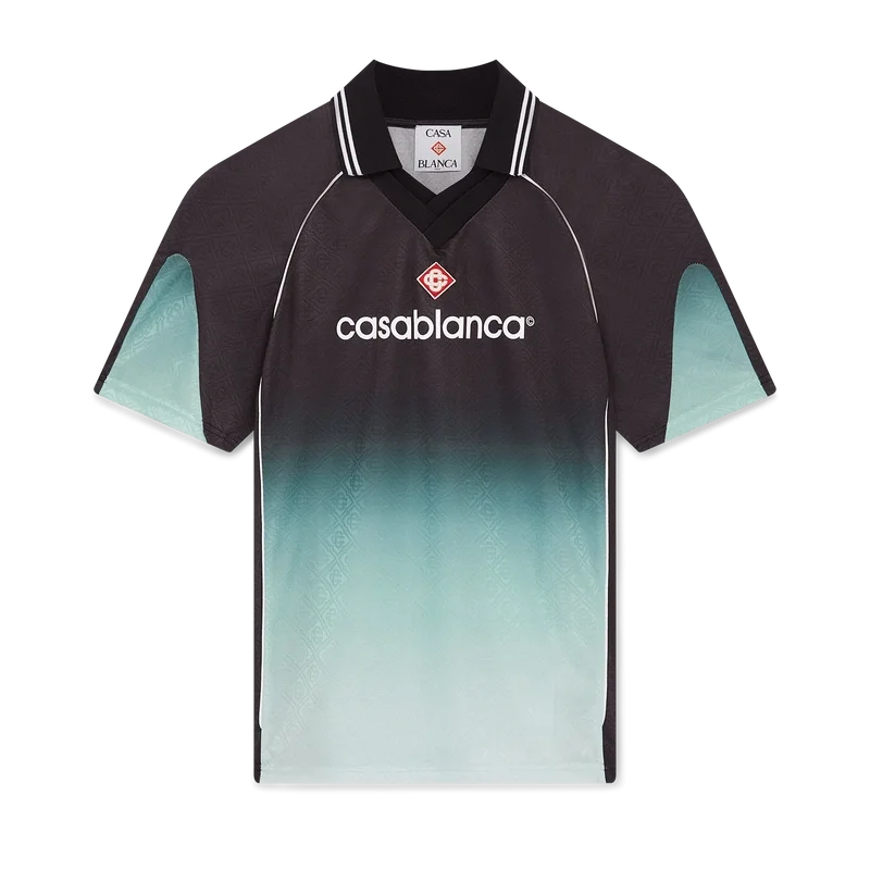 Het Jacquard Gradient voetbaloverhemd is een model met korte mouwen in de kleurstelling van het Park Hyatt – een iconisch hotel in Tokio dat mintgroen en zwart in het interieur heeft verwerkt – vervaardigd uit jacquardstof met Diamond Monogram in kleurverloop. Afgewerkt met het kenmerkende diamantlogo van het huis, een geribde kraag en een Casablanca-logo op de borst.