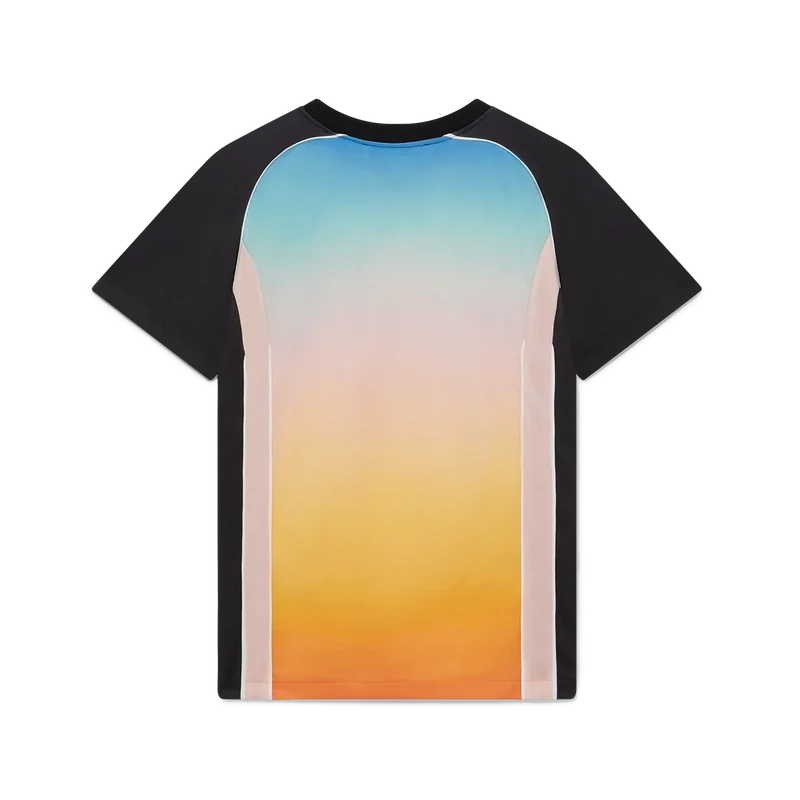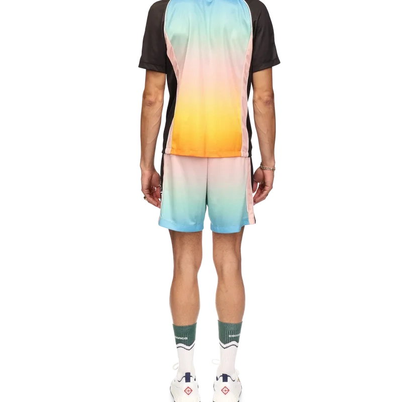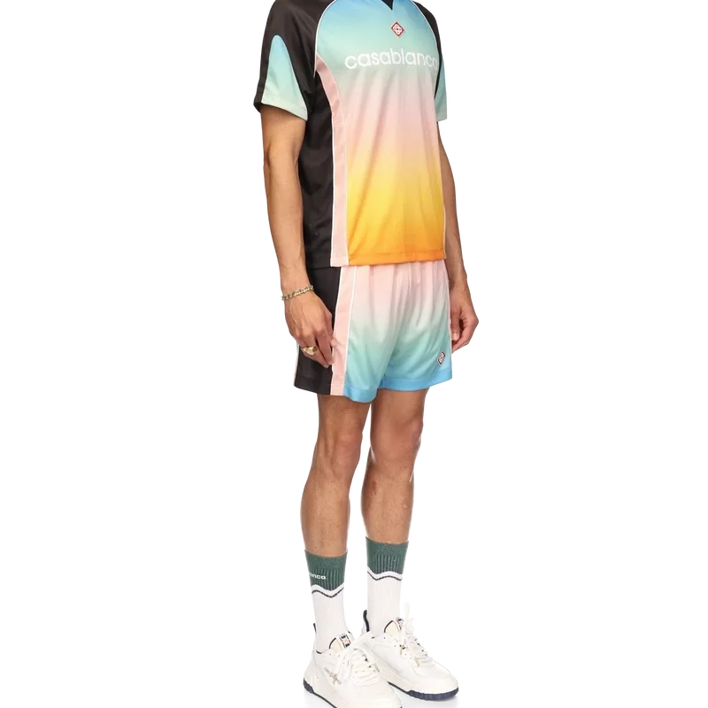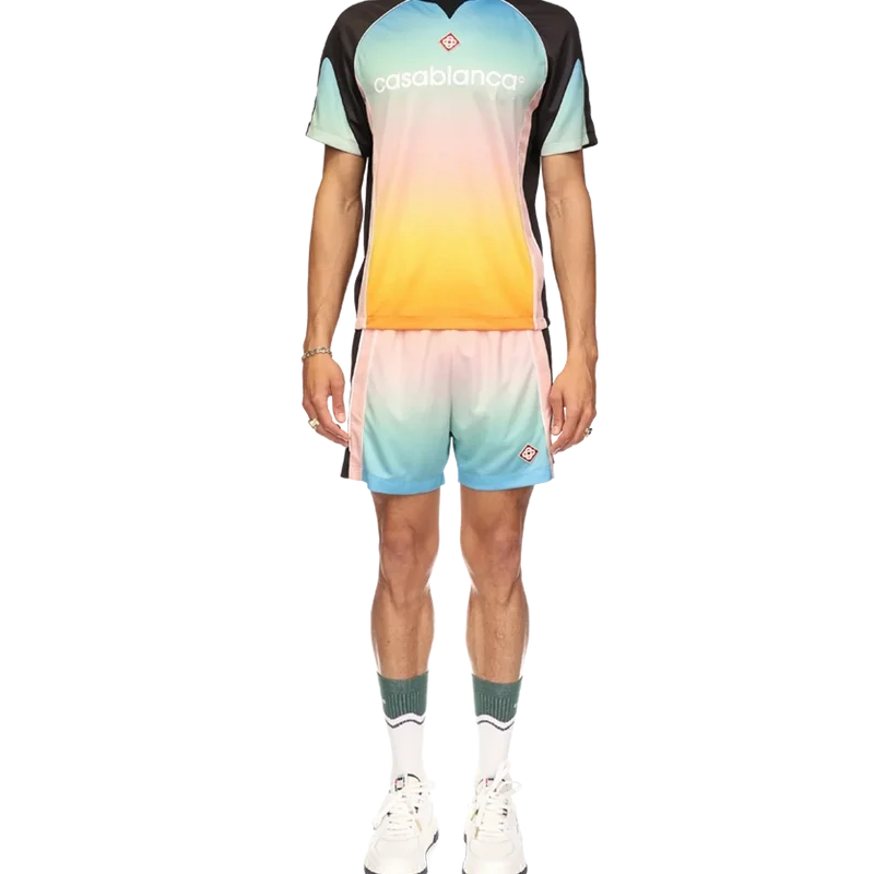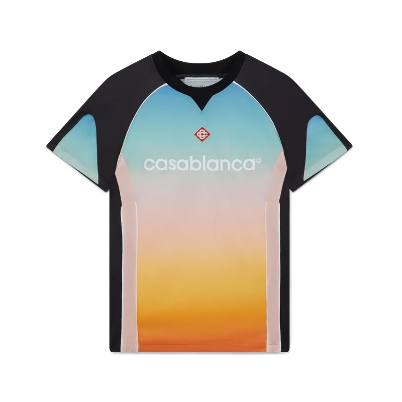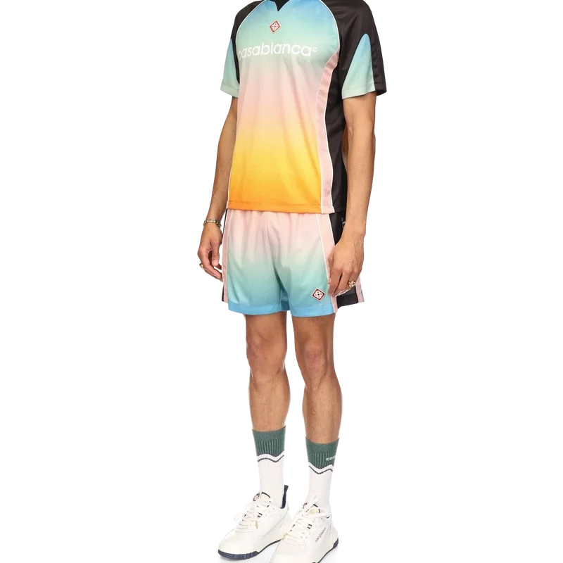 Het voetbalshirt met pastelkleurig kleurverloop is een sportshirt met korte mouwen en een reeks pastelkleuren in kleurverloop die de etherische thema’s benadrukken die centraal staan in ons merk. Gemaakt van Birdseye Mesh en afgewerkt met het kenmerkende diamantlogo van het huis en het Casablanca-logo op de borst, met een klassieke ronde hals.