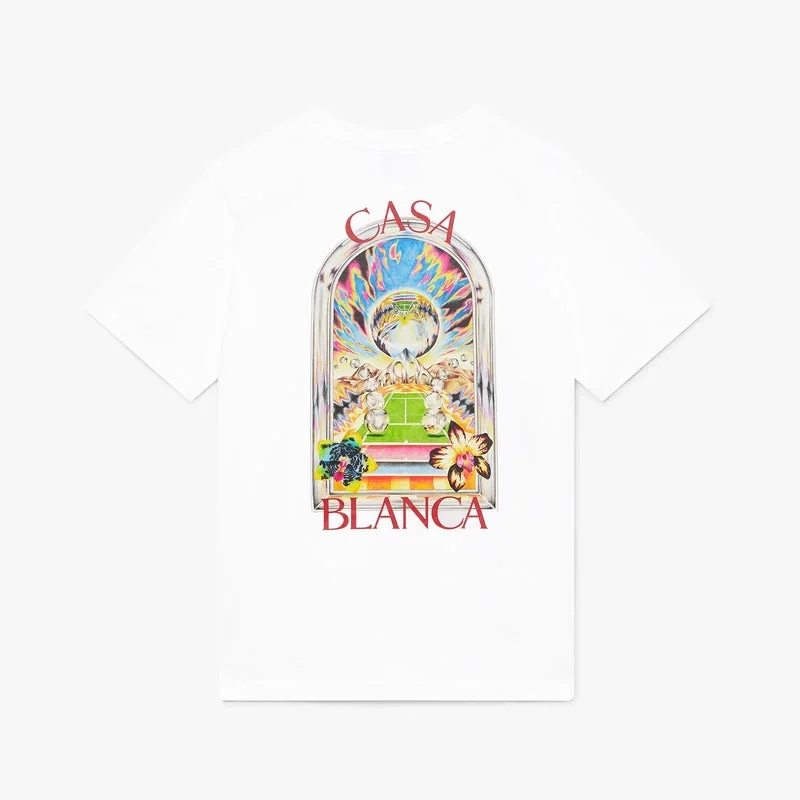 Het witte Tennis Landscape T-shirt met korte mouwen heeft een verfijnd ontwerp met een print waarin onderling verbonden kaders verschillende scènes vormen die de transcendentie van tijd en plaats beschrijven door de focus op sport. Afgewerkt met een klassieke ronde hals en een relaxte pasvorm.