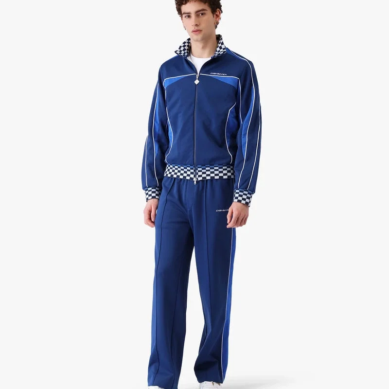 Het Navy Cyber Tricot trainingsjack heeft een verfijnd ontwerp dat de verfijnde benadering van sportkleding van het huis belichaamt. Afgewerkt met een gebreide hoge kraag, een ritssluiting, biezen langs de schouders en mouwen, een voering, zijzakken, het Casablanca-logo van het huis en een kraag, manchetten en zoom met een ruitpatroon in kleurverloop.